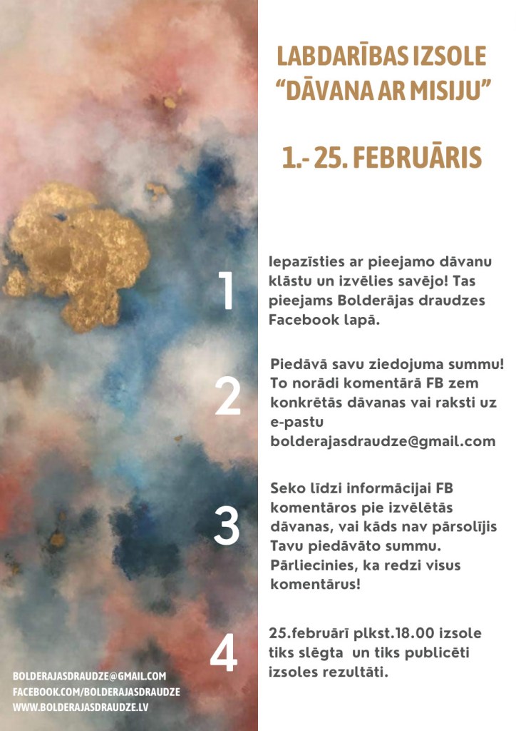 “Dāvana ar misiju” norisināsies laikā no 1. – 25.februārim. Labdarības izsole notiek neklātienē, sociālā tīkla tīmekļa vietnē Facebook – Bolderājas draudzes profilā. Izsolē var piedalīties gan tīmekļa vietnē reģistrēti, gan nereģistrēti dalībnieki.