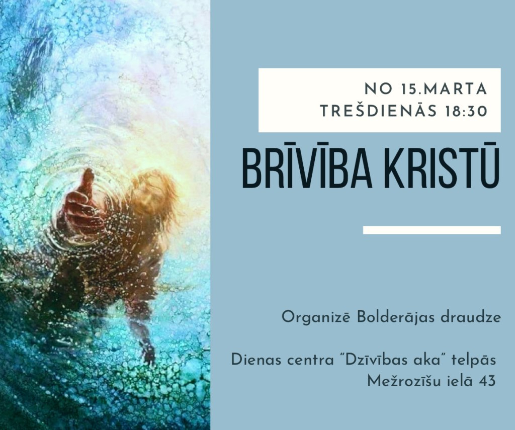 Šajā pavasara sezonā, no 15.marta, Bolderājas draudzē norisināsies kurss “Brīvība Kristū”. Šis kurss ir paredzēts ikvienam kristietim – gan tiem, kuriem ir jau ilgstoša ticības pieredze, gan arī tiem, kuri tikai nupat ir izvēlējušies sekot Jēzum. Kursā ietvertas tādas tēmas kā “Mūsu ikdienas izvēles”, “Kā salauzt pagātnes varu”, “Piedot no sirds”, “Palikt uz pareizā ceļa” un citas. Kurss ir veidots tā, lai palīdzētu ieraudzīt, kas mums traucē pieņemt un izdzīvot savu patieso identitāti, kas mums ir dota caur Jēzu Kristu, kā arī spert soļus, lai piedzīvotu Dieva Mīlestību visā tās pilnībā. Jēzus caur savu nāvi pie krusta ir devis mums brīvību no grēka varas, devis iespēju dzīvot patiesā brīvībā ik dienas, un tikai no mums pašiem ir atkarīgs, vai šo dāvanu pieņemam, vai nē.