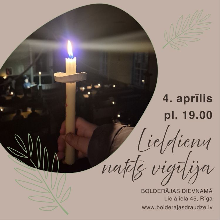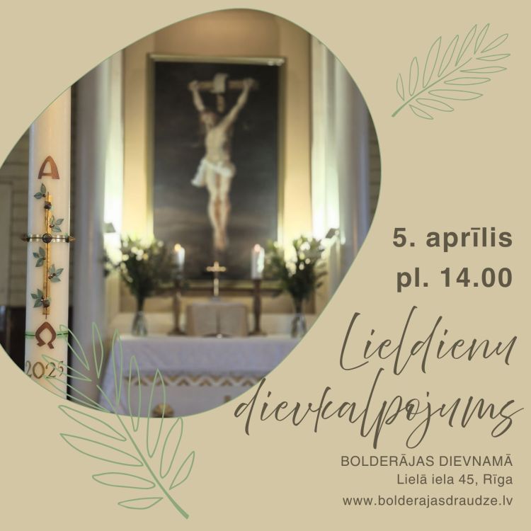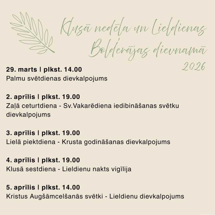 Aicinām arī Tevi būt daļai no dievkalpojumiem Bolderājas dievnamā, kad svinēsim mūsu pestīšanas svētkus, no Palmu svētdienas līdz pat Lieldienām. Būsim kopā sveicot Kungu ar palmu zariem, mazgājot kājas un svinot Kunga mielastu, pagodinot Kunga krustu un ar gavilēm saucot vispriecīgākos vārdus, kas vēstī, ka Kungs ir mūžam dzīvs.